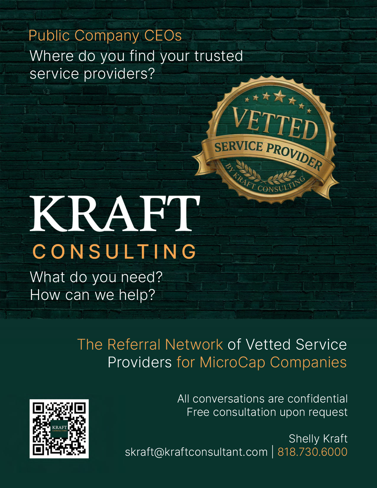 Kraft Consulting LLC is a California based boutique advisory firm specializing in micro-cap, small-cap, and pre-IPO companies. Founded in 2019 by Wall Street veteran Shelly Kraft, the firm operates as a high-level strategic coordinator, connecting emerging public companies with a curated ecosystem of capital markets, compliance, investor relations, and financial service providers.