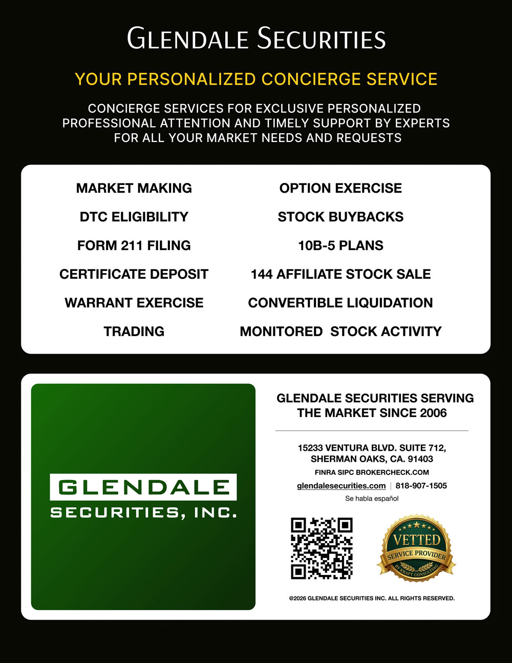 A FINRA-registered broker-dealer specializing in OTC market making and micro-cap services. Glendale executives have referred issuers to Shelly Kraft, demonstrating cross-industry trust and collaboration.